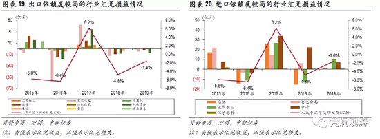 从2015年至2019年期间上述行业的汇兑损益情况来看,进、出口依赖度较高的行业在2015年(人民币贬值年份)多取得汇兑损失;出口依赖度较高行业在2016年、2018年和2019年(人民币贬值年份)基本取得汇兑收益,在2017年(人民币升值年份)获得汇兑损失,与预期基本一致;进口依赖度较高行业在2016年、2017年的汇兑损益情况与预期相反,在2018年、2019年取得的汇兑损失才有所增加(见图表19、20)。这表明,汇率变化对各行业汇兑损益的影响不定。