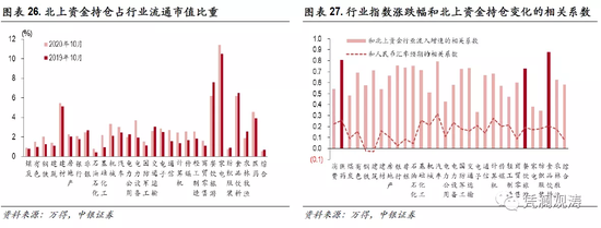 上文提及资本流动是汇率影响股市的重要渠道之一。随着陆股通逐渐成为外资进入国内股票市场的重要渠道,北上资金可能建立了人民币汇率和某些特定行业指数之间的连接。理论上,当本币升值预期较强时,北上资金流入增加,那么最有可能受影响的便是北上资金重点持仓行业指数表现。从北上资金持仓占行业流通市值比重可以看出,家电、餐饮旅游、食品饮料、建材、医药等行业是北上资金重仓行业(见图表26)。2016年8月至2020年11月期间,食品饮料、餐饮旅游、医药行业指数变化和北上资金流入增速高度相关,但各个行业指数变化和汇率预期的相关性均较弱(见图表27)。这表明,虽然北上资金是影响行业指数涨跌的重要因素,但我们无法直接根据汇率预期的变化预判北上资金重仓行业指数的走势。