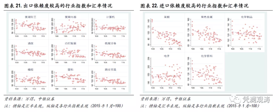 进一步,从各行业指数来看,2015年1月至2020年11月期间,在出口依赖度较高的行业中,只有家电行业指数和汇率走势表现出一定的正相关性,其他行业指数和汇率之间基本为负相关(见图表21)。在进口依赖度较高的行业中,采掘、有色金属和化学制品行业指数和汇率表现出负相关性;电子行业进、出口依赖度都比较高(分别为39.8%、20.2%),汇率对指数的影响较弱;化学原料的进、出口依赖度较为接近(分别为14.9%、11.6%),但行业指数和汇率依然表现出负相关性(见图表22)。