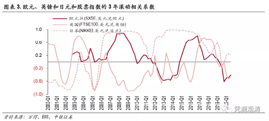 2000Q1至2020Q3期间,欧元区、英国和日本汇率和股价相关性总体为正,意味着本币贬值、股市上涨。但3年滚动相关系数显示,各国汇率和股价的相关关系并不稳定。