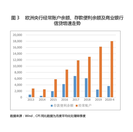 负利率政策的实施并没有解决欧洲商业银行超额准备金“滞留”央行的问题,消费信贷略有改善但企业融资需求仍然较低。政策实施后欧元区的经常账户和存款便利余额持续上涨(见图3)。隔夜存款利率转负后,商业银行多余的流动性并没有大幅投向信贷领域,反而因为同业拆借利率同样转负的情况下继续留存在央行。尤其是存款便利余额在2017年高峰时期达到6841亿欧元,是2014年末的7倍。直至2019年,存款便利余额才有所下降,却仍远高于2015年之前的水平。欧元区整体消费信贷略有改善但企业融资需求仍然较低。欧洲央行数据显示,欧元区家庭消费信贷增速从负利率政策实施后次年(2015年)转正,且2015年至2019年维持在5%左右的水平。但经济低迷、税负较重等因素叠加使得企业信贷需求不高,企业信贷增速在2014至2015年均为负,2016年以后增速转正却持续低于2%。
