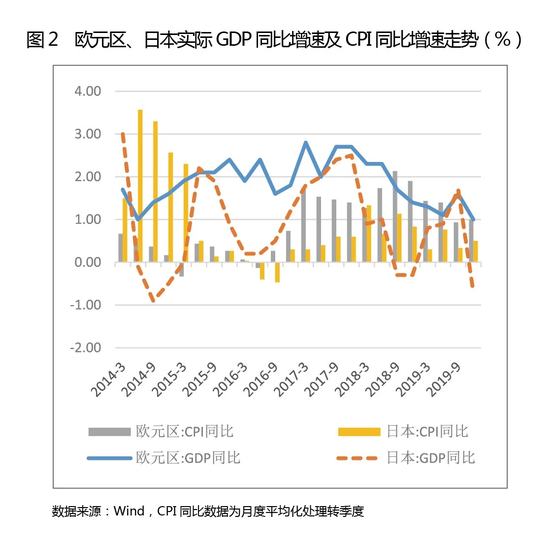 欧日等六个经济体实施负利率政策整体上没有改变其“低增长、低通胀”的现状。欧元区及日本的政策目标均是2.0%的通胀水平,但是其分别实施负利率后,日本CPI同比数据从未超过1.5%,欧元区仅在2018年有6个月CPI略超2.0%,且两个经济体的GDP增速也持续低迷,日本更在2018年下半年又陷入负增长(见图2)。新冠肺炎疫情的暴发加重或延长了这一趋势。