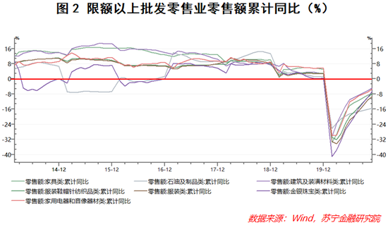 在需求端,虽然疫情得到控制,经济恢复较快,但主要靠投资及净出口拉动,消费的恢复十分缓慢,实物类消费品中,消费信贷渗透率较高的家电、服装、家具等消费品迟迟难以恢复到疫情前水平(见图2)。