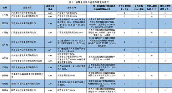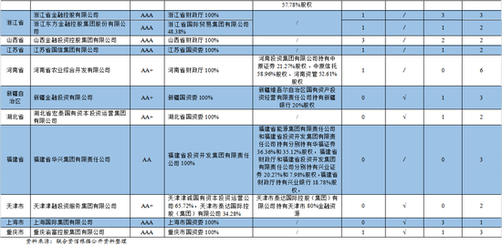 截至目前,中国省级金控平台布局基本完成。国内除港澳台地区的省份(含直辖市)、自治区,除河北、青海、宁夏、西藏外,其余省份或自治区均已成立了地方金控平台,部分国企改革进展较快的省份甚至拥有多家地方金控平台,如山东省的山东省鲁信投资控股集团有限公司、山东省财金投资集团有限公司,广东省的广东粤财投资控股有限公司、广东省粤科金融集团有限公司。在省级金控平台基本覆盖的基础上,多数省会城市也通过改制重组的方式逐步建立了相应的金控平台,如广州金融控股集团有限公司(广东)、杭州市金融投资集团有限公司(浙江)、武汉金融控股(集团)有限公司(湖北)。目前部分经济发达的地区金控平台的发展也在逐步推进,如青岛、苏州、珠海、无锡、厦门等地均设立相应的金控平台。总体看,地方金控平台在全国大面积铺开,省级基本全覆盖,地级和县级平台根据当地经济发展情况有序推进,多数省市地方金控平台通过直接市场进行融资且公开市场评级中枢很高,为债券市场上较为重要的发行主体。