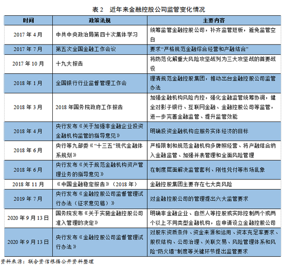 在金融分业监管治理下,金融控股集团旗下各类业务可能涉及多个监管当局,但由于监管机构的监管目的、方法和重点各不相同,缺乏有效的信息交换机制,也难以统一协调行动,对于金融控股集团的全面监管存在一定局限;金融控股集团快速发展的同时,存在个别企业违规盲目扩张、金融空转套利,导致市场主体良莠不齐。为促进金融控股集团健康发展,国务院、中国人民银行等机构发布了一系列金融控股集团相关的监管政策(如表2)。