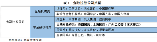 近年来,随着金融业跨业投资步伐加快和投资金融业的实体企业日益增多,逐步形成了各类多元化经营的金融企业集团,国内金融控股集团的快速发展成为中国金融市场创新的一个重要现象。按照金融控股公司控制主体视角分类,主要分为两大类金融控股公司。一类是金融机构跨业投资控股形成的金融集团,包括银行系金融控股公司,如五大行均已拥有基金、金融租赁、保险子公司;非银行金融机构系金融控股公司,如中国平安、中国人寿等;另一类是非金融企业投资控股两种或两种以上类型金融机构,事实上形成了金融控股公司,此类金融控股公司可大致分为4种类型,其中地方政府批准设立的金融控股公司是本次研究对象,一般是由地方国资委或财政厅出资成立,通过控股或参股地方金融或类金融企业等而形成的综合性的地方金融控股集团。