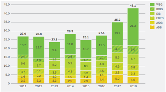图 1 2011—2018年多边开发银行气候融资总额(单位:十亿美元)[8]