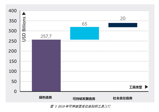 但以固定收益产品为例,尽管发行量不断增加,贴标的可持续固定收益类工具仍然面临挑战。绿色债券一直是债务资本市场的主要气候融资解决方案,从发行人整个资产负债表的角度来看,其没有考虑承受气候投资风险和机会[15]。2007年到2018年,绿色债券的累计发行量为5210亿美元。根据气候倡议组织(CBI)估计,仅在2018年,绿色债券发行总额就达到1670亿美元,到2019年增至2577亿美元(图3)[16]。投资者对气候变化意识的增强可以导致可持续固定收益工具的增长,同时也需要从发行人和发行层面进行衡量制定出积极投资方法以应对气候变化的潜在风险和机遇。