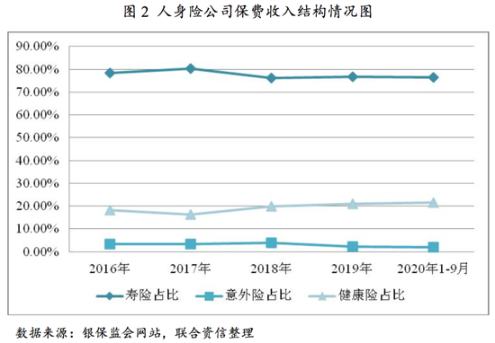 从人身险保费收入结构来看,近年来以健康险为代表的长期保障型险种占比有所提升。2020年以来,在新冠肺炎疫情的影响下,居民保障意识有所增强,对长期保障型健康险需求有所增长。2020年1—9月,寿险和健康险业务收入分别占人身险原保险保费收入的76.47%和21.58%。
