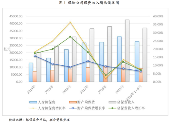 2020年初,受新冠肺炎疫情影响,第一季度我国保险行业业务开展增速有所放缓,但随着疫情影响的逐渐消退、国民经济增长逐步恢复、企业复工复产、居民生活恢复正轨,第二季度以来,随着保险公司线下展业不断恢复,保费收入规模整体有所回升。2020年1—9月,我国保险公司实现总保费收入3.70万亿元,同比增长7.16%,仍以人身险公司原保费收入为主。人身险保费收入方面,受年初新冠肺炎疫情影响,使得保险公司线下展业面临一定困难;加之部分企业停工停产及面临一定经营危机导致居民可运用现金流趋紧,致使寿险保费收入有所下滑;2020年1—9月,人身险原保费收入2.64万亿元,同比增长2.07%,增速明显放缓。财产险保费收入方面,由于健康险、农业险、责任险等非车险业务较好的开展,带动财产险保费收入同比呈较好增长态势;2020年1—9月,财产险公司实现保费收入1.06万亿元,同比增长22.34%。万能险及投资连结险方面,受近年来,监管机构对保险公司保险产品的不断规范治理影响,中短存续期的万能险类产品基本停售,整体业务规模持续下滑。