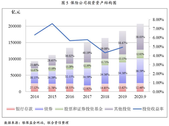 在经历2017年之前投资资产结构持续调整、投资收益率波动较大的阶段后,随着近年来投资品种的不断扩容,保险公司投资资产结构逐步趋稳。2017—2019年,保险公司投资资产中的非标类资产占比受到持续压降,权益类资产占比整体有所提升,固定收益类投资资产仍为配置主力,近年来占比基本保持稳定;投资收益率于2019年有所回升,但在目前低利率市场环境以及优质非标项目稀缺的背景下,未来投资收益水平的增长或面临一定压力。