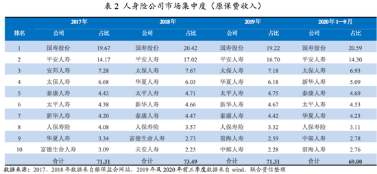 随着银保监会对人身险公司的监管趋严,监管政策对于人身险公司的规范经营与治理的要求不断提升,政策推动下人身险公司逐步回归保险保障的业务本源。部分头部险企依托于在产品体系、销售渠道、品牌影响力等方面的绝对优势在监管趋严及2020年初新冠肺炎疫情冲击的背景下仍保持相对稳定的市场份额,其中部分险企市场份额有所提升。此外,得益于近年来的业务结构调整以及渠道建设的不断完善,中小保险公司的市场竞争能力有所提升,整体行业集中程度有所下降。2020年1—9月,保费收入前10家人身险公司原保费收入占比为69.00%,较上年末下降2.31%。其中,国寿股份、平安人寿、太保人寿市场地位相对稳定,新华人寿、泰康人寿和中邮人寿市场份额有所上升,而华夏人寿因受接管等因素导致市场份额有较明显下降。