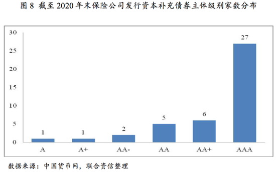 从发债保险公司主体级别来看,截至2020年12月25日,我国市场上存续资本补充债的保险公司共有42家,其中AAA级别27家(见图10)、AA+级别6家、AA级别5家、AA-级别2家、A和A+级别各1家分别为天安财险和长安责任保险,发债主体信用水平整体较好。评级展望方面,除因被接管的天安财险列入信用观察名单、被接管的天安人寿评级展望为负面外,其余保险公司主体评级展望均为稳定;此外大家人寿因安邦集团整体被监管接管,2018年评级展望被下调为负面后再无评级结果公布,并于2020年9月债券到期兑付。