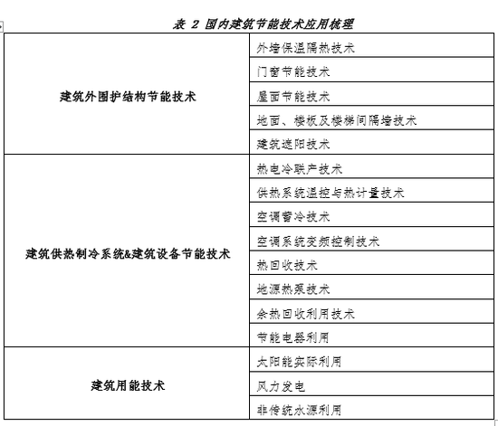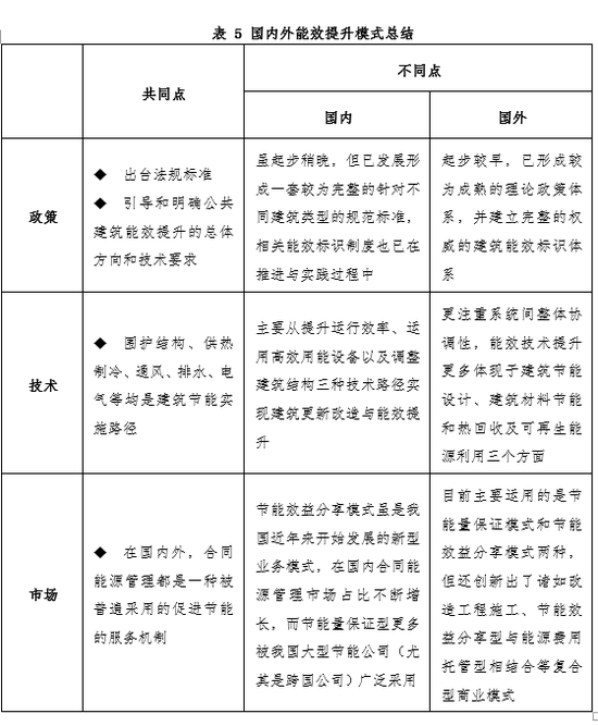 技术层面,国内外建筑节能标准基本围绕围护结构、供热制冷、通风、排水、电气等方面开展相关工作。国内主要从提升运行效率、运用高效用能设备以及调整建筑结构三种技术路径实现建筑更新改造与能效提升,而国外则更注重系统间整体协调性,能效技术提升更多体现于建筑设计节能、建筑材料节能和热回收、废热及可再生能源利用三个方面。