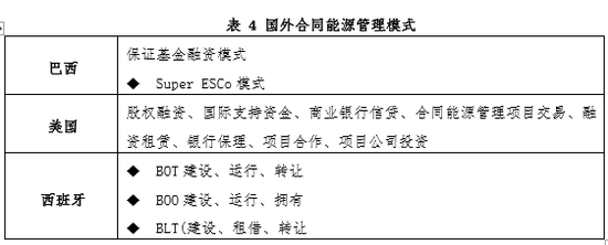 美国结合自身发展,大力推进ESPC模式,由电力公司向政府机构应交的电费的一部分收取转给节能服务公司,使得ESPC在美国得以快速成熟。西班牙除了分享节能收益合同外,还有BOT(建设、运行、转让),BOO(建设、运行、拥有)和BLT(建设、租借、转让)三种形式。