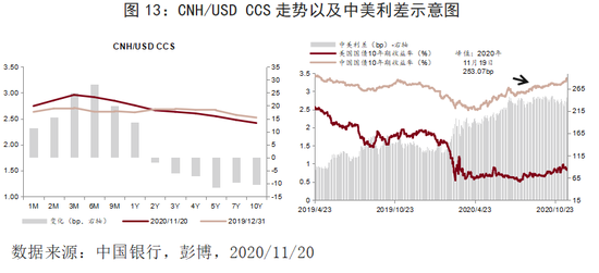 从离岸人民币利率走势来看,CNH/USD CCS曲线整体较2019年末更为平坦化,短端在在岸人民币流动性收紧的背景下明显上行,长端反而有所下行。与在岸CNY/USD CCS曲线进行对比后不难发现,离岸人民币利率整体变动更为温和,当前整体较在岸水平低20-30bp。值得一提的是,中美十年期主权利差已突破并在200bp上方盘整,人民币资产的吸引力已经更为凸显。