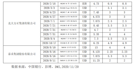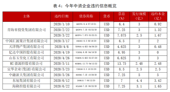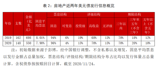 从整体分布来看,票息结构、评级结构、以及期限结构的分布基本和2019年相似,但平均票息仅降低10bp。较为明显的是,平均融资规模从去年4.3亿美元下降至3.7亿美元,跌幅达到了15%左右。目前在宏观情绪较为波动的情况下,投资情绪较为谨慎,普遍体现为缩短久期以及风险偏好进一步分层。对于信用资质本身有瑕疵的地产企业,需要给出较高的溢价以吸引投资人,且可实现的融资规模缩小。