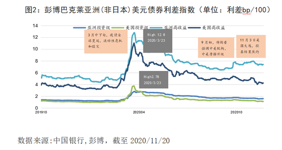 从欧元投资级债券信用利差的走势来看,2020年年初相对去年底保持平稳,但随着欧洲疫情的蔓延,三月初利差陡峭走宽,在3月18日升至今年最高位置为138bp,随后利差逐渐缩窄至11月底的51bp,较年初小幅提升了8bp。但相比较于美国及亚洲的利差水平,欧元投资级利差长期处于低位,预计未来该趋势仍会持续。
