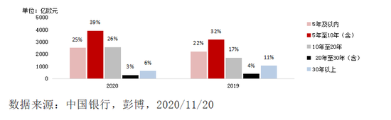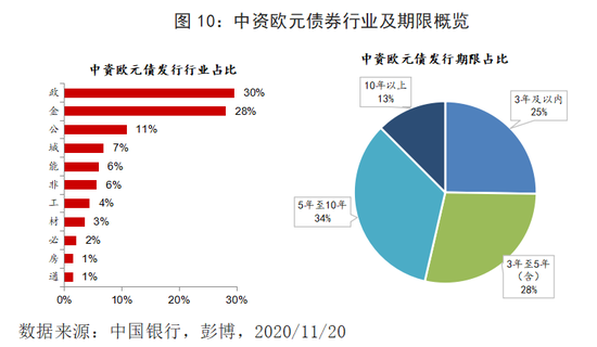 中资欧元债券体量有所增加,但是整体仍旧位于较低水平,亟待进一步挖掘和拓展。截至2020 年11月30日,中资欧元债共发行17支,持平去年水平,均为固息;总发行金额约合119亿欧元,同比增长12%。从行业分布来看,主要集中在主权(发行量占比34%,较去年持平)、政策性银行(发行量占比19%,较去年持平)及国有四大商业银行(发行量占比13%,较去年的21%下降7个百分点)。发行人分类以政府、金融及公用事业为主。从发行期限上来看,除了中国财政部发行了10、15 年期债券及国家电网的6、12年期债券在中长期区间,其余发行期限均在5年期或以内。