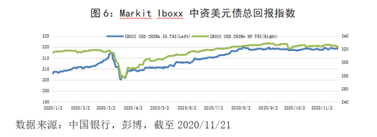 从券种的总回报走势来看,在基准利率显著下行的环境下,尽管年初信用利差大幅度拉宽,但整体仍然呈现小幅度涨势,且投资级表现好于高收益板块。Markit Iboxx中资美元债券总回报指数显示,投资级和高收益板块表现相对同步,全年整体呈现“一波三折”,在三月初大幅下跌触底后开始反弹。较年初而言,截至2020年11月24日,投资级板块总回报率上涨约5%,高收益板块总回报率上涨约3%。