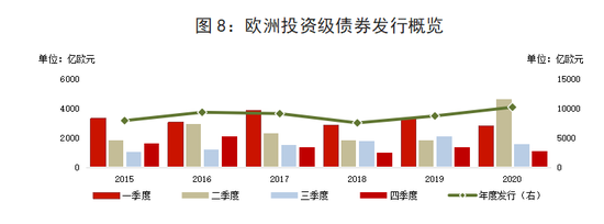 根据数据统计,截至2020年11月20日,欧洲一级市场中欧元债券总发行量为1.65万亿,创下历史新高,较去年同期水平增长27%,其中投资级发行占比上升4各百分点至92%。国别风险分布显示,占比最大依次为德国、法国及意大利,合计占比近半。行业分布显示,其中45%为政府类债券,30% 为金融机构类债券,其余为公司类债券。而公司债券中,非必需消费品、公用事业及工业占比最大,占年度发行总量突破15%。值得注意的是,自2015年至2019年,发行高峰期均为一季度为主,占全年发行量的30%-40%;而2020年发行量在第一季度受疫情影响之后,发行高峰期递延至二季度,且占今年总发行量达到45%,凸显出欧洲政府及企业通过债市筹集资金应对疫情冲击的特点。从年期分布来看,投资级债券的发行年期以5-10年期为主,占比39%,较去年增长7个百分点;10-20年期2020年占比26%,较去年增长9个百分点;5年及以内期限同比变化不大,30年期以上占比较去年增长5%,发行期限同样出现延长。