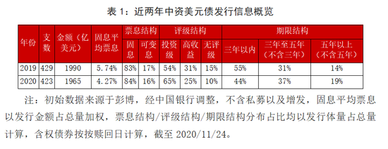 作为核心板块,中资美元债券发行支数及发行体量同样已经接近2019年全年水平,达到了1965亿美元。整体特征表现为固息为主,投资级占比提升,融资期限有所延长,金融取代地产成为最大板块。