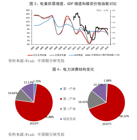 一是电量供需稳定增长。2002年至2019年间,全国发电量由1.65万亿千瓦时增长至7.50万亿千瓦时;全社会用电量由1.64万亿千瓦时增长至7.23万亿千瓦时,曾经因发电能力不足造成大面积、长时间缺电的现象已成历史。整体来看,电量的供给和需求随着社会经济发展保持稳步增长(图3)。二是清洁电力生产比重明显提高。近十年来我国清洁电力生产比重实现稳步提升。2020年10月,一次电力中的水电、核电产量和风电发电量占比合计为33.6%,较上年同期提高3.9个百分点,相比2010年10月提升11.2个百分点。三是电力消费结构不断优化。2019年,全社会用电量为7.23万亿千瓦时,同比增长4.47%,较2010年14.76%的增速有大幅下降;一、二、三产和城乡居民生活用电量分别同比增长4.5%、3.1%、9.5%和5.7%。与2010年相比,2019年我国第三产业和居民生活用电的占比均有所提升,合计已超过总用电量的30%,第二产业用电量占比下降6.56个百分点(图4)。总体而言,电力消费结构的变化与当前我国发展方式转变、经济结构优化、增长动力转换的社会经济现状相适应。