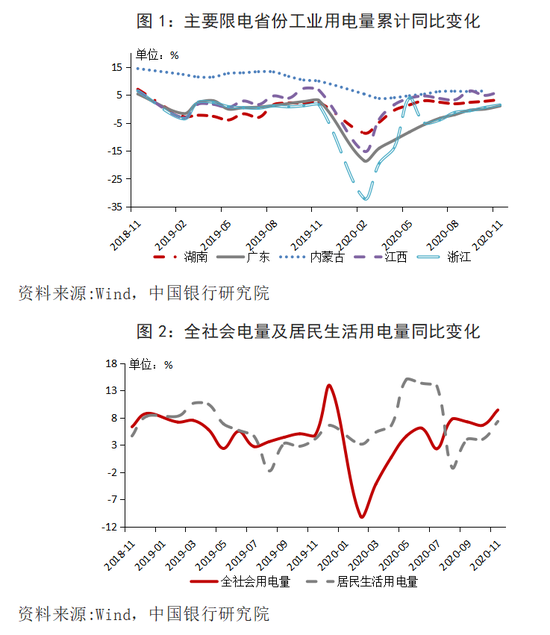 一是用电需求旺盛。一方面,工业用电需求快速增长。受疫情影响,2020年国内大量工业订单推迟到下半年并延续至年底,叠加下半年国外对我国工业订单大幅增加,导致下半年工业生产繁忙。据统计,2020年11月,湖南规模以上工业增加值同比增长7.4%;江西规模以上工业增加值同比增长7.9%。工业生产增加造成工业用电需求大幅增长。湖南工业用电量累计同比自5月起转负为正,到11月达年内最高值3.3%。广东、内蒙、江西等地工业用电量累计同比也在11月达到高峰(图1)。另一方面,居民用电需求快速增长。受“拉尼娜现象”影响,2020年我国冷空气活动较以往年份增多,寒冬提前来临,居民采暖用电需求的高峰较往年提前。据统计,2020年11月我国全社会用电量同比增加9.4%,居民生活用电量同比增加7.3%,以往年份通常要到12月之后才会达到这一增速(图2)。另外,从电力消费结构来看,湖南居民用电量占比在国网经营区内排名第一,接近30%,受降温影响,今冬居民采暖需求增长尤为突出。