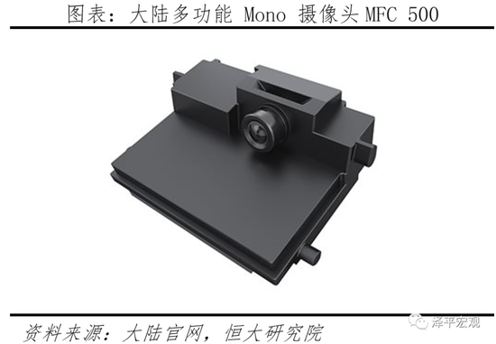 视觉传感器方面,镜头像素从200万逐渐增加到400万、800万,摄像头从单目往双目、多目方向发展。汽车在自动驾驶过程中,要求车载摄像头能够:1)看得远(留出足够的反应时间);2)看得清(成像清晰精度更高);3)看得广(尽量减少盲点和意外)。但是这三者之间不可兼得,在看得远的同时,视角就会变窄;此外由于车载镜头本身变焦能力很差,一般都是定焦,所以其远距离成像也会变得很模糊。在此背景下,采取增加摄像头,并对不同摄像头进行分工的多摄像头方案就成为行业新趋势。以特斯拉为例,其2016年Autopilot 2.0系统中,使用的三目摄像头,一个视野角度是50°,负责一般性道路状况监测;一个视野角度是25 °,用于探测前方的车道线、红绿灯;还有一个视野角度是150°的鱼眼镜头,用来探测并行车道的状况、行人和骑自行车的人。下图是车载摄像头全球龙头大陆集团发布的两款车载摄像头产品,据其官网介绍,双目车载镜头可以满足多种自动驾驶场景如前方碰撞警告(FCW)、车道偏离警告系统(LDW)、交通标志识别系统 (TSA)、智能前大灯控制系统(IHC)等,可大大提高安全性。