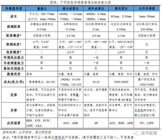 不同传感器由于工作原理不同,其优缺点各异,适合的应用场景也有所差异:1)视觉传感器(摄像头),其优点在于探测距离较远、分辨率高,且能识别路标和交通信号灯,但是其缺点也很明显,对光线要求很高,容易受天气影响;2)毫米波雷达,其优点在于探测距离远、灵敏度高、穿透性强,但是其缺点在于对非金属不敏感、静止测距能力弱、很难探测物体大小和形状;3)超声波雷达,其优点在于成本低、精度高,但是其缺点在于反馈时间长,只适用于倒车等短距离场景;4)激光雷达,其综合性能最好,不仅灵敏度高、探测角度广,而且可探测多数物体,精度高、且可3D建模,但是其缺点在于成本高昂、受天气影响大;5)红外传感器,最大优势在于可以夜视,但是其灵敏度、静止测距、探测角度都比较一般。具体比较如下表所示,其性能参数为公开资料和行业龙头产品参数综合,实际可能有一定出入。