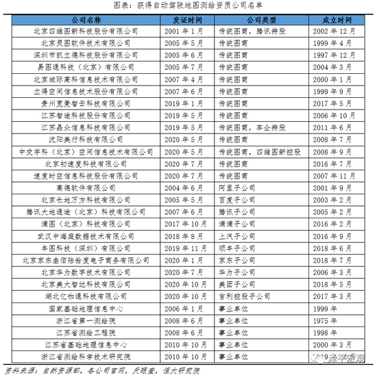 2016年2月,国家测绘地理信息局发布《关于加强自动驾驶地图生产测试与应用管理的通知》明确指出:自动驾驶地图属于导航电子地图的新型种类和重要组成部分,其数据采集、编辑加工和生产制作必须由具有导航电子地图制作测绘资质的单位承担。截止到2020年10月底,根据自然资源部审批公示,我国目前拥有高精地图测绘资质的厂商一共28家,按照背景可分为三类:1)传统图商,以四维图新、凯立德、立得空间等为代表,共13家;2)互联网企业子公司,以高德、长地万方、滴图等为代表,共10家;3)事业单位,以国家基础地理信息中心、江苏省测绘工程院为代表,共5家。