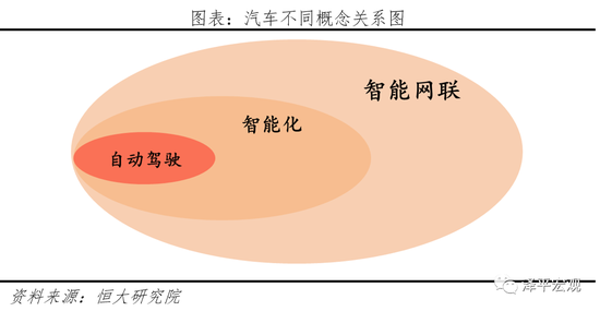 智能网联汽车同时包含汽车“智能化”和“网联化”两大属性,而汽车智能化又可细分成“驾驶智能化”和“座舱智能化”两方面,其中驾驶智能化也称为自动驾驶。智能网联汽车、智能汽车、自动驾驶三者关系如下图所示:智能网联汽车范围最广、智能汽车次之、自动驾驶最小。