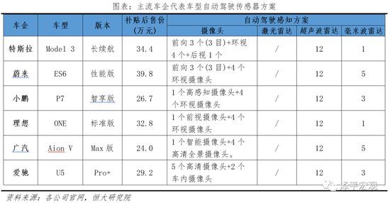 当前主流感知系统硬件组合为“1个前视摄像头+4个环视摄像头+12个超声波雷达+3个毫米波雷达”,根据电动车百人会预测,2020年摄像头、超声波雷达、毫米波雷达平均成本分别为60美元、12美元、90美元,对应总成本在714美元。而根据2020年8月,广汽蔚来发布的BOM(物料清单)表,其整车BOM成本为257022元,其中前向雷达总成1544元、盲区检测传感器1260元、全景泊车系统1012元、生命探测系统593元、倒车雷达系统496元,感知系统硬件总计在4905元;与百人会的预测较为一致。