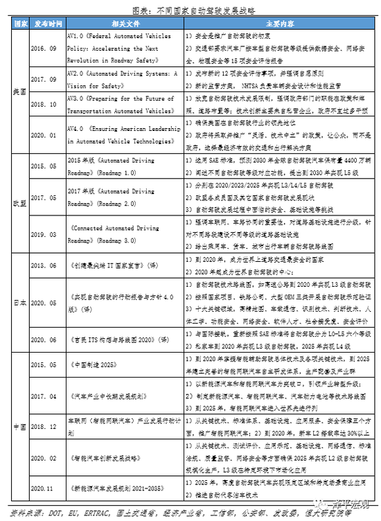 4)中国:官方关于自动驾驶的阐述最早见于《中国制造2025》,提出到2020年掌握智能辅助驾驶各项关键技术,到2025年建立完善的智能网联汽车自主研发体系,生产配套及产业群。2017年4月,国务院、工信部等联合发布《汽车产业中长期发展规划》提出,以新能源汽车和智能网联汽车为突破口,引领产业转型升级,制定新能源汽车、智能网联汽车、汽车动力电池等技术路线图,到2025年,智能网联汽车进入世界先进行列。值得注意的是,2020年2月发改委、网信办、工信部等11部委联合发布《智能汽车创新发展战略》,指出智能汽车已成为全球汽车产业发展的战略方向,发展智能汽车对我国具有重要的战略意义,需要从关键技术、测试评价、应用示范、基础设施、网络通信、标准法规、质量监督、网络安全等方面确保2025年实现L2级自动驾驶规模化生产,L3级在特定环境下市场化应用。