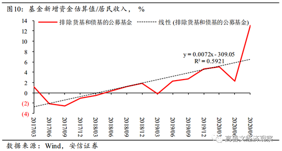三季度以后,如果以趋势线为基础,相比正常模式,居民部门把接近5个百分点的收入配置到了公募基金市场上。