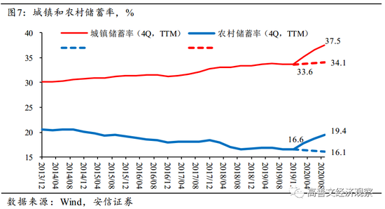 在2020年上半年,居民部门预防性储蓄上升接近6个百分点,而居民部门存款的上升幅度有12个百分点。存款的上升幅度显著高于预防性储蓄的上升幅度,这中间6个百分点的差距是从哪里来的呢?