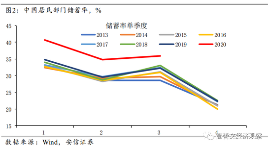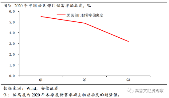 如图2所示, 2020年前三季度居民储蓄率相比往年均出现显著抬升,反映了居民面对不确定性时预防性储蓄的上升。