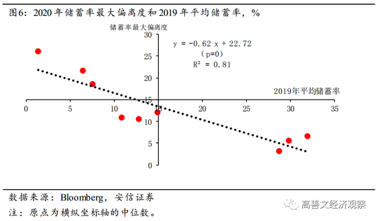 为了刻画预防性储蓄的上升幅度,我们可以进一步对历史上储蓄率的季节性数据计算平均值,进而得到2020年居民部门储蓄率相对正常模式的背离。这一背离充分反映了由于新冠疫情爆发所导致的预防性储蓄变化。