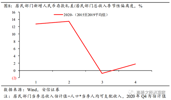 如图8所示,图中数据反映出,相比历史上同期,2020年居民部门在银行体系的存款变化占可支配收入的比例的偏离程度。需要说明的是,这里的存款变化,已经扣除了居民从银行体系获得的贷款的变化。