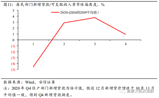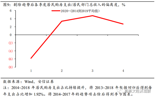 如图9所示,2020年三、四季度,居民部门购房的支出比正常情况多2-4个百分点。