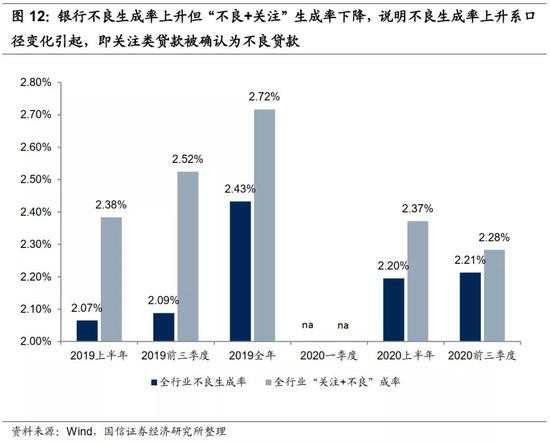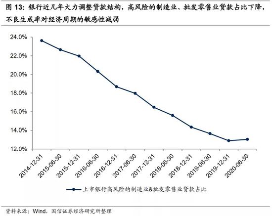 (1)银行业在2020年加大不良确认力度,将大量关注类贷款确认为不良贷款。从银保监会披露数据来看,虽然银行业的不良生成率今年同比增加,但增加的主要原因是银保监会要求银行加大不良确认和处置力度,导致大量关注类贷款被确认为不良贷款,即口径变化导致了银行账面不良生成率的提高。我们通过测算“关注+不良”生成率来剔除口径变化的影响,可以发现,银行业“关注+不良”生成率同比是下降的。我们认为背后的主要原因,是银行近几年来大力调整了贷款结构,因此虽然宏观经济总体下行压力较大,但银行不良生成率对经济周期的敏感性减弱;