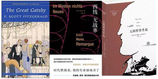 20年代具有代表性的名著,左起:《了不起的盖茨比》、《西线无战事》,《太阳照样升起》