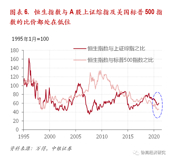 当前,港股与A股和美股的比价都处在低位,有利于港股在流动性推动下的上扬。尽管流动性只是决定股价的一个因素。但是,考虑到当前港股恒生指数相比A股上证综指和美股标普500指数的比价都处在较低水平,基础货币增加对港股的推动作用会更容易体现出来。(图表 6)