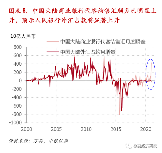 2020年12月,中国大陆商业银行代客结售汇顺差已显著攀升,预示外汇占款将显著增加。与外汇占款紧密相关的一个指标是商业银行代客结售汇顺差。这个顺差反映了商业银行体系给居民和企业结汇的净额(银行从居民企业买入外汇的数量减去银行卖给居民企业的外汇数量)。由于商业银行自身持有外汇的能力和意愿有限(商业银行持有的外汇并不能帮助其开展人民币业务),所以结售汇顺差最终会由人民银行接盘,变成外汇储备的增加,带来外汇占款的发放。2020年12月,商业银行结售汇顺差规模陡然上升,创出了2014年2月以来的最高水平。而同期,人民银行资产负债表中的外汇占款一项却小幅下降。但从过去经验来看,这二者不可能长期显著背离。展望未来,人民银行外汇占款的大幅增加应该是大概率事件。(图表 8)