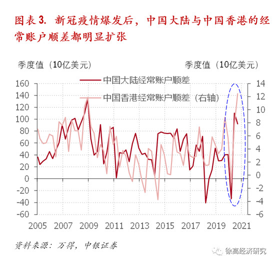 全球再循环中,中国香港随同中国大陆一道,见证了外需对经常账户顺差的明显带动。通过外汇占款这一途径,央行的货币政策与一个经济体的国际收支联系了起来。贸易顺差国(经常账户顺差国)通常会有外汇占款带来的基础货币投放。新冠疫情爆发之后,全球总需求在宽松政策推动下走强,且其他国家生产活动受疫情负面影响,这使得我国出口明显扩张,令我国经常账户顺差从2020年2季度开始明显走高。香港作为中国大陆商品出口的一个重要通道,其经常账户顺差也在新冠疫情爆发之后明显扩大,并在2020年3季度创下了十多年来的新高。中国大陆和中国香港经常账户顺差的明显放大会对两地流动性带来影响。(图表 3)