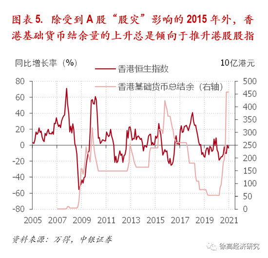 香港基础货币结余量的上升有利于港股走强。通常来说,基础货币越多,金融市场流动性越充裕,金融资产价格越高。香港的历史经验也证实了这一点——基础货币上升一般伴随着恒生指数的上扬。过去十年中唯一的例外是2015年——当时香港的基础货币结余量虽然明显上升,但港股受A股“股灾”的影响却明显走低。进入2021年,全球股市都在同步走强,没有像2015年A股“股灾”那样极端外部负面影响的拖累,恒生指数更容易受香港基础货币增加的带动而走强。(图表 5)
