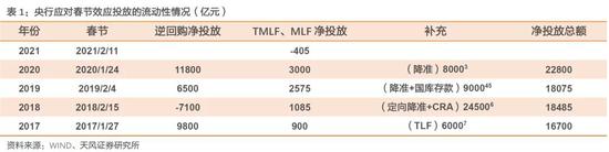 我们以春节前央行公开操作的第一笔跨年资金为央行投放春节流动性的起点,以距离除夕的日期计算,2020年央行投放春节流动性的起点为(T-9),2017年和2019年的起点为(T-21),2018年的起点为(T-21),并据此计算春节前央行净投放,结果如表1所示。
