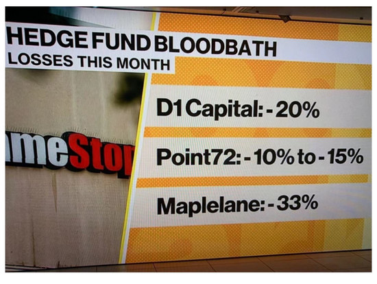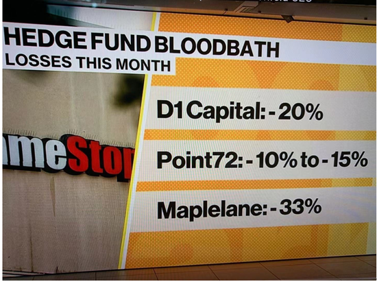 按照周三晚上收盘后公开的做空量,Melvin在 GME一个仓位上就亏了10亿。但按照Plotkin向Citadel和Point72 要求紧急调款补仓的情况看,Melvin可能空的量比最后公布的要大很多,而且起肯定有卖出期权。同时,还有其他被曝光的空仓仓位也被股民挤兑了。