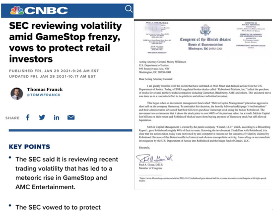 江湖起风波,散户齐喊冤,自然有盟主们出来话事。先是有两位国会财经委员会要求召开听证会之外,然后是国会议员Paul A.Gosar写公开信要求🇺🇸美国司法部检察总长就限制散户购买GME等股票,以及 Citadel、Robinhood和Melvin之间的股权关系开展反垄断调查。我划一下重点: 这次就看D先生这次怎么洗脱 “predatory and manipulative conduct ”的指控了。至少Robinhood CEO的辩解让人觉得苍白无力。