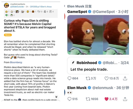 当Robinhood无端禁止散户交易GME股票时,马斯克大哥更是仗义直言 - Let People Trade,然后配图是两个翻白眼的猴子卡通(长得很像Robinhood的CEO)。😄哈哈,解气 !